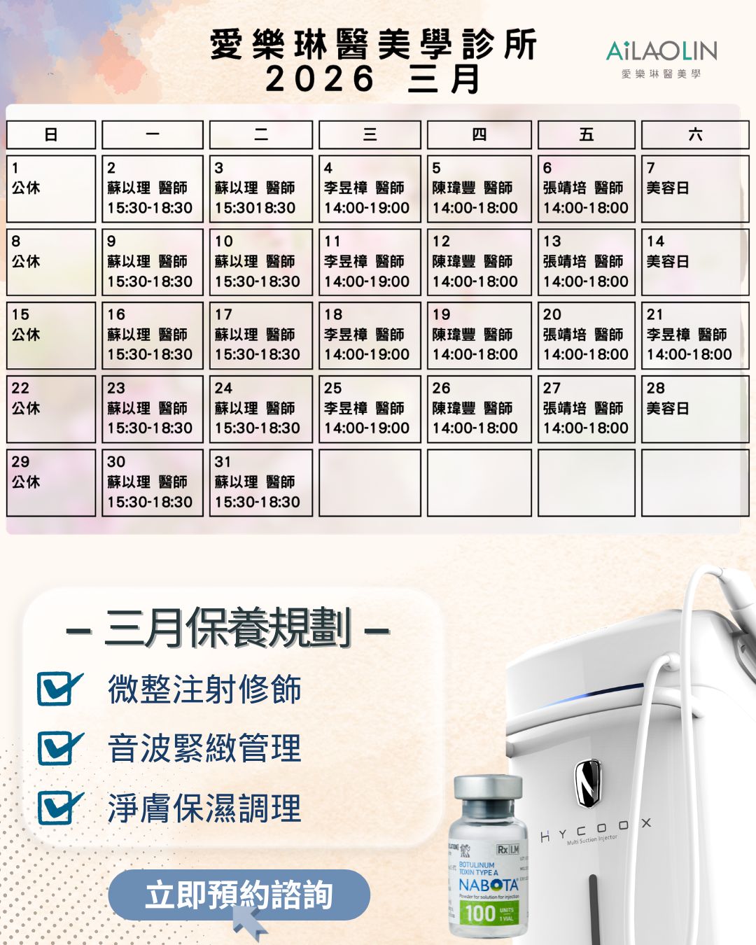 很多人會問:現在適合安排什麼保養?三月同時提供多項保養療程選擇:🔹 微整評估諮詢🔹 音波與提拉保養🔹 雷射與淨膚調理🔹 保濕導入與代謝點滴