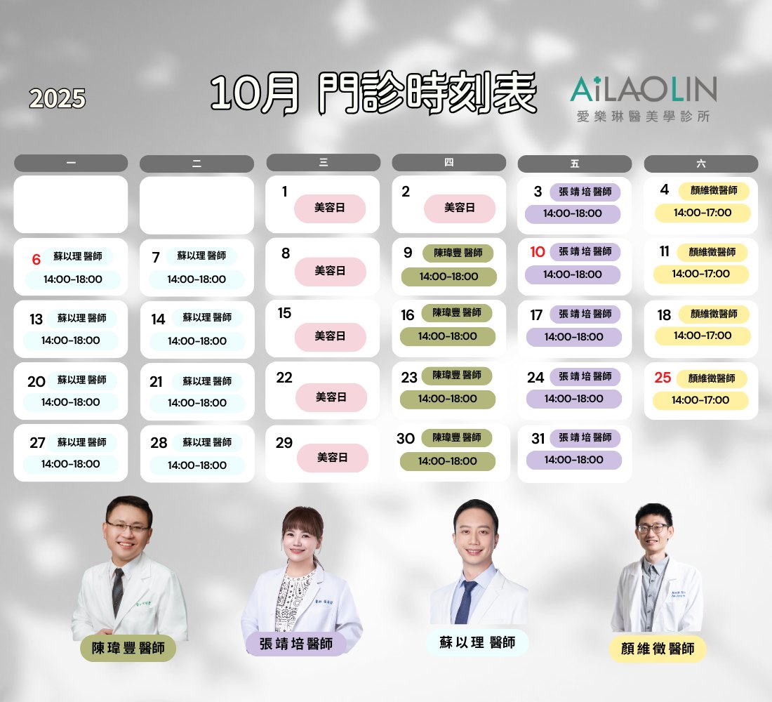 愛樂琳 10月門診時刻表,熱騰騰出爐啦! 秋天的氣息漸濃,正是保養煥膚的好時機!快來看看醫師們的班表,提前預約你的美麗時光吧!想找哪位醫師?我們都幫您整理好了! 蘇以理 醫師› 每週一、週二|14:00-18:00溫柔細心,為您解決各種肌膚煩惱。 張靖培 醫師› 每週五|14:00-18:00專業美感,打造屬於您的精緻輪廓。 陳瑋豐 醫師› 每週四|14:00-18:00經驗豐富,提供全方位的醫美建議。 顏維徵 醫師› 每週六|14:00-17:00假日限定,讓週末也能持續變美。 每週三為固定美容日適合定期保養、肌膚護理的您!熱門時段很快就滿了,現在就手刀卡位!期待在愛樂琳與您相見 愛樂..