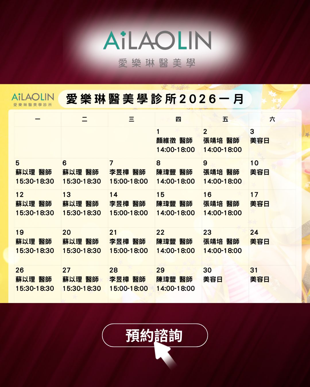 1月門診表出爐囉! 迎接 2026,我們陪你一起開始 愛樂琳醫美學診所